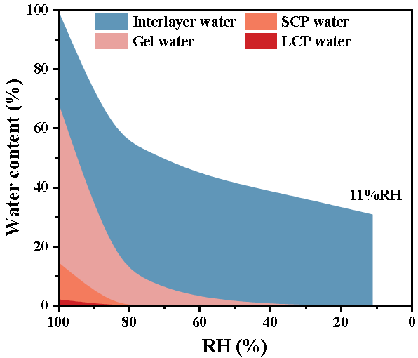 隨著RH降低,凝膠水含量顯著減少,層間水含量先增加后降低,這主要是由于凝膠水的失去導(dǎo)致C-S-H層間距的減小,凝膠孔向?qū)娱g孔轉(zhuǎn)變。85% RH平衡后HCP內(nèi)仍有16.45%的凝膠水和42.04%的層間水。59%RH平衡后HCP內(nèi)凝膠水含量?jī)H為1.99%,層間水含量達(dá)到41.61%。隨著RH的降低,層間水含量開(kāi)始下降,11%RH平衡后HCP內(nèi)部層間水含量?jī)H為30.73%。
