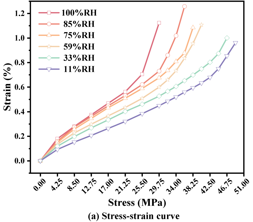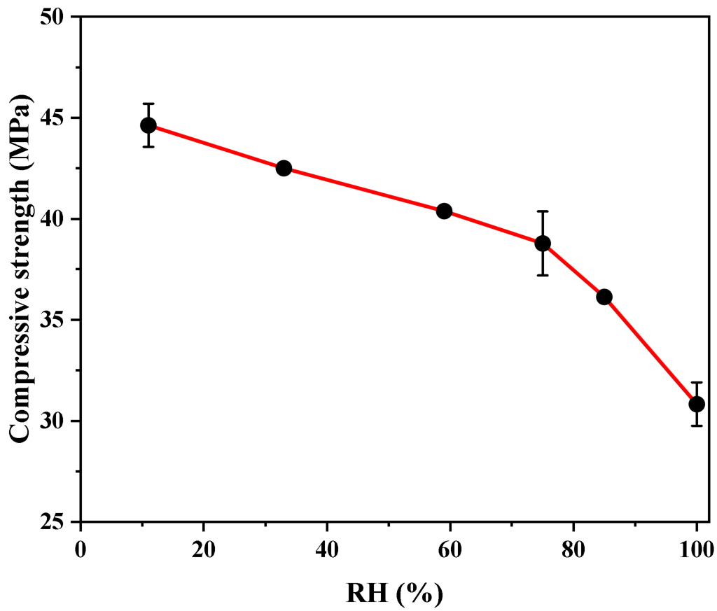 圖4為不同環(huán)境濕度平衡情況下HCP的抗壓強(qiáng)度??箟簭?qiáng)度隨著RH增加而降低。