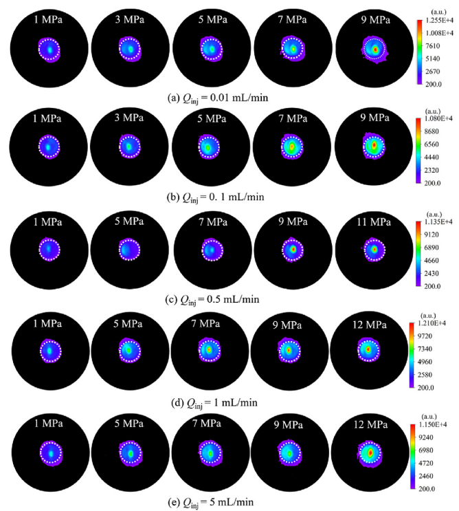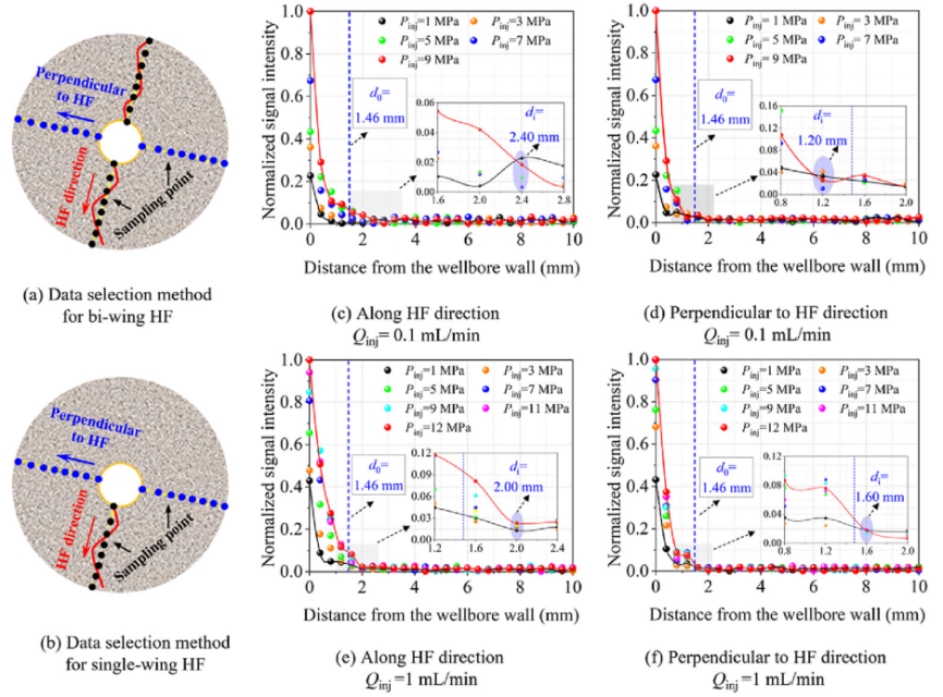 注入速率是決定水力壓裂有效性的關鍵因素,然而,注入速率對孔隙和裂隙結構(PFS)以及注水增壓過程中流體滲透的影響很少被探索。這項研究中,在自主研發的集成核磁共振(NMR)和水力壓裂實驗系統上,對不同注入速率的圓柱形砂巖樣品進行了水力壓裂。結果表明,低注入速率主要導致宏觀孔尺度損傷;而高注入速率則促進微觀孔尺度損傷,這可能是由于孔隙內粘土礦物的吸附膨脹效應。此外,低注入速率樣品的水分含量持續增加,而高注入速率樣品的水分含量先增加后穩定。磁共振成像(MRI)表明,壓裂過程中的流體滲透由于井筒周圍固有的非均勻PFS分布而表現出高度各向異性。此外,存在一個主要的流體滲透路徑,它與水力裂隙的起始方向一致。然而,隨著注入速率的增加,沿水力裂隙方向的流體滲透損傷距離減小,而垂直于水力裂隙方向的流體滲透損傷距離大約等于特征長度,與注入速率無關。最后,我們建議使用注水增壓過程中的孔隙損傷作為選擇支撐劑粒徑的依據,并利用主要流體滲透路徑來預測水力裂隙的起始。這些發現為致密氣藏水力壓裂設計提供了寶貴的見解。