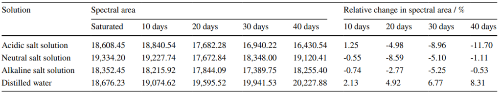 表2展示了不同溶液和浸泡時間(如0天、10天、20天、30天和40天)下T2譜面積的變化率,以及這些變化如何反映孔隙結(jié)構(gòu)的動態(tài)變化,有以下分析: