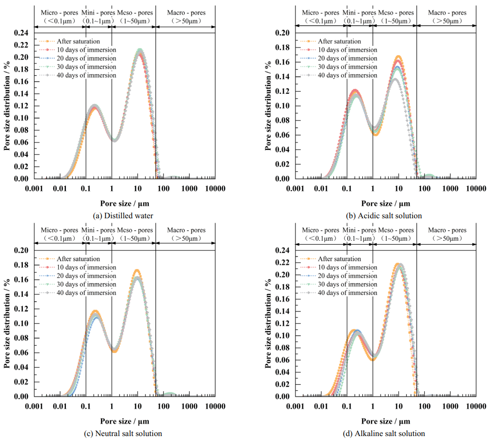 3)堿性鹽溶液:微孔比例減少(28.91%),中孔和大孔比例顯著增加(中孔增至71.09%,大孔增至4.12%)。堿性環(huán)境促進礦物溶解和鹽結(jié)晶,形成新孔隙。