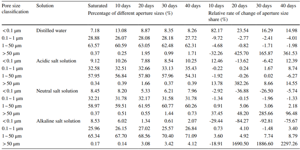 1)孔隙分布變化:在酸性鹽溶液中,微孔和小孔的百分比顯著增加(如從0天的41.70%增加至40天的45.68%),而中孔和大孔減少。這表明酸性環(huán)境促進了礦物溶解和孔隙擴展。