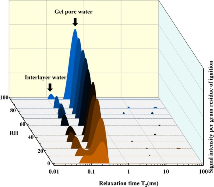 基本上,從圖6中可以看出。層間水的T2值在D-R循環期間沒有表現出明顯的變化,而凝膠孔隙水的T2值在干燥期間逐漸減少,在隨后的再飽和過程中增加,這可以用一個簡單的水去除-補充過程來解釋。有趣的是,在給定的RH(RH>11%)下,重飽和度曲線中的凝膠孔隙水的T2值低于干燥曲線中的T2值,這表明當C-S-H經歷了嚴重的干燥處理(RH為0%)時,與初始飽和C-S-H中的凝膠孔隙水相比,水分子在C-S-H凝膠孔隙中的約束更高。凝膠孔的尺寸減少和吸收減少都可能導致更多的凝膠孔隙水的限制,從而降低了T2值。