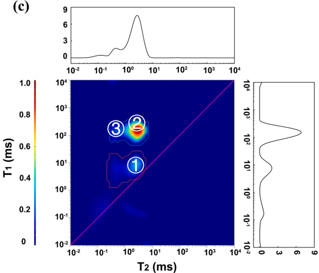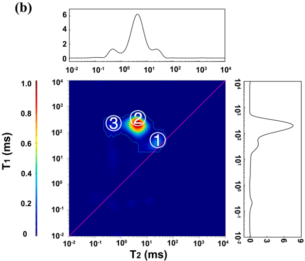二維T1-T2 NMR:進一步分離重疊的組分,使得在復雜體系中也能準確識別不同含氫組分的弛豫時間特征。