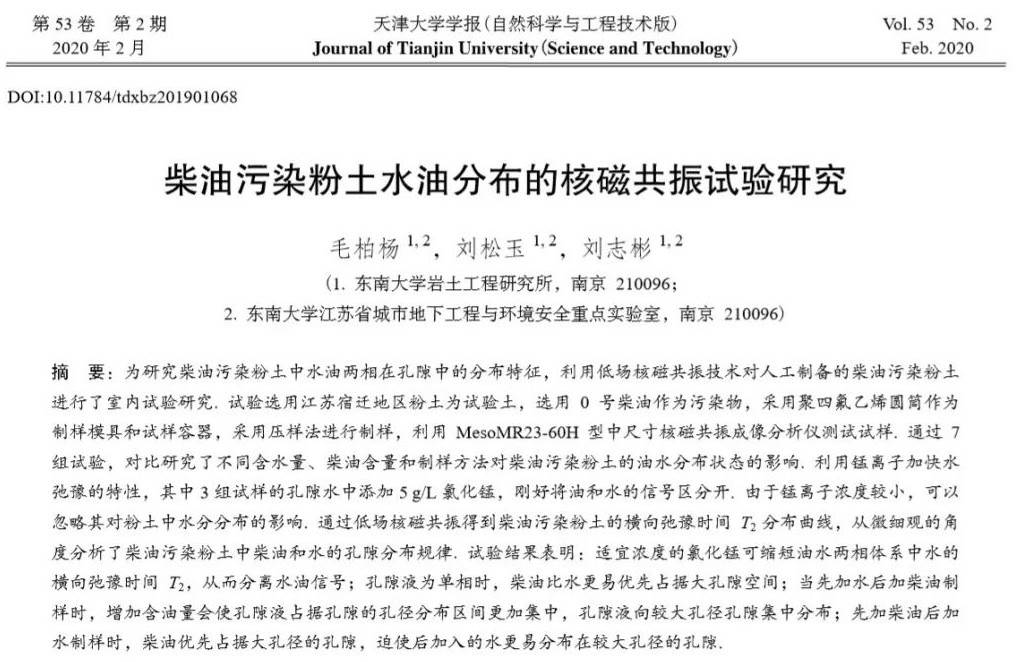 大家好,今天小編精挑細選了一篇在2020年2月剛剛出版在《天津大學學報》上的一篇文章,利用核磁共振技術研究柴油污染粉土中水油在孔隙中的分布規律,研究過程并不復雜,但結果很有意思,希望對大家有所幫助!