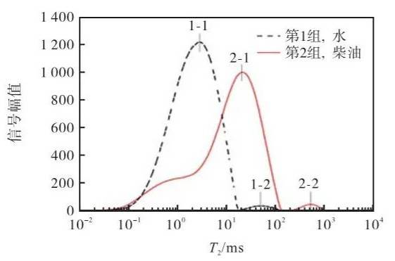 單體系中,柴油比水更易占據較大孔隙 如圖2所示,1和2分別是僅有水或者柴油的試樣。明顯看出,第 1 組試樣的 T2 分布區間主要集中在 0.1~10.0ms;第 2 組試樣的 在T2分布區間主要集中在 0.1~100.0ms且0.1ms附近較少;弛豫時間與對應孔隙的孔徑成正比(核磁共振測試孔徑分布的原理),0.1~10.0ms 對 應孔徑較小的孔隙,10.0~100.0ms 對應孔徑較大的孔隙,因此我們可以得出:單體系中,柴油比水更容易占據較大孔隙。