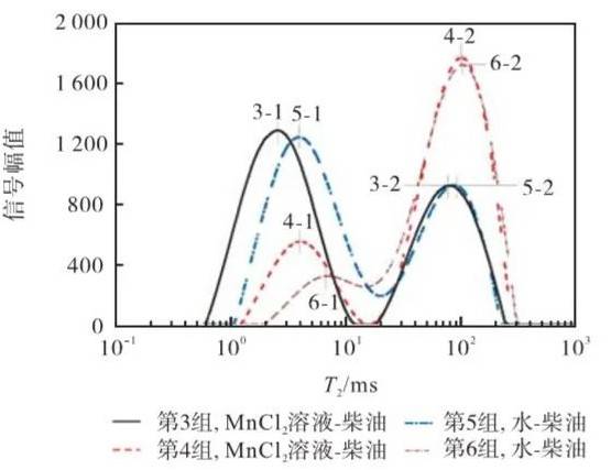 4 組試樣較第 3 組試樣的 T2 區間小,并且區間的左端點右移,第 6 組試樣和第 5 組試樣相比也有相似的變化規律。此外,第 4 組和第 6 組的第 2 峰面積在總峰面積中的占比遠大于第 3 組和第 5 組。 以上說明,在 MnCl2 溶液-柴油體系和水-柴油體系中,當含水量不變時,柴油含量的增加使流體在試樣孔隙中的孔徑分布空間更加集中,表現為向大孔徑孔隙分布的趨勢,導致孔隙油分布變化的原因主要是含油量增加導致孔隙油分布形態發生變化。