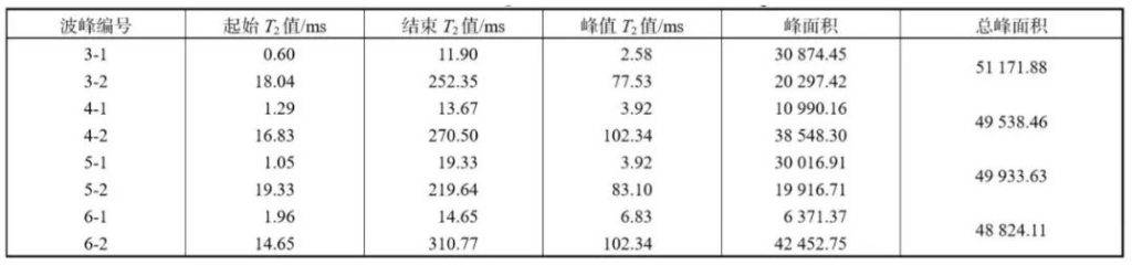 與圖2類似,第 3~6 組試樣的T2譜曲線均呈雙峰狀。由于 5g/L的 Mn2+作用,第 3、 4 組已經將油和水的信號分離,其 T2 譜曲線雙峰分離。進一步分析每個峰的情況,現在對4組曲線進行定量分析。