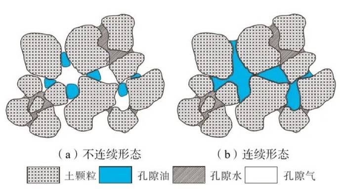 究其原因,在多孔介質中, 非水相液體(NAPLs)可能賦存形態為不連續形態和連續形態(圖 5)。其中當 NAPLs 的含量超過殘余飽和度時,NAPLs 更多地以連續形態存在,但不會占據所有大孔隙空間。粉土中的柴油作為非浸潤液體,可能因為含油率的增加,小孔隙油(如圖 5(a)所示)合并為大孔隙油(如圖 5(b)所示),分布在大孔隙中。 03