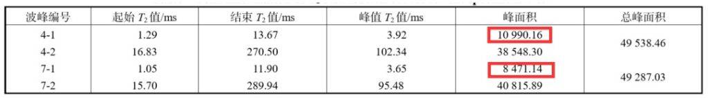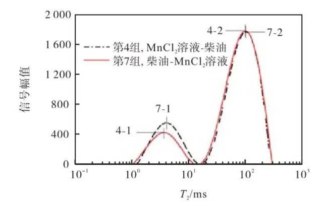 第 4 組和第 7 組試樣的總峰面積幾乎相等,這說明配制的樣品是可靠的。進一步分析發現,發現第 7 組的第 1 峰面積略小于第 4 組的第 1 峰 面積。 相應地,第 7 組的第 2 峰面積略大于第 4 組的 第 2 峰面積.由于第 2 峰主要由柴油的核磁信號構 成,第 1 峰主要由 MnCl2溶液的核磁信號構成,因此,相較于制樣時第 1 相為水的情況,第 1 相為柴油時,柴油優先進入較大孔徑的孔隙,后加入的水更多地進入大孔徑的孔隙。